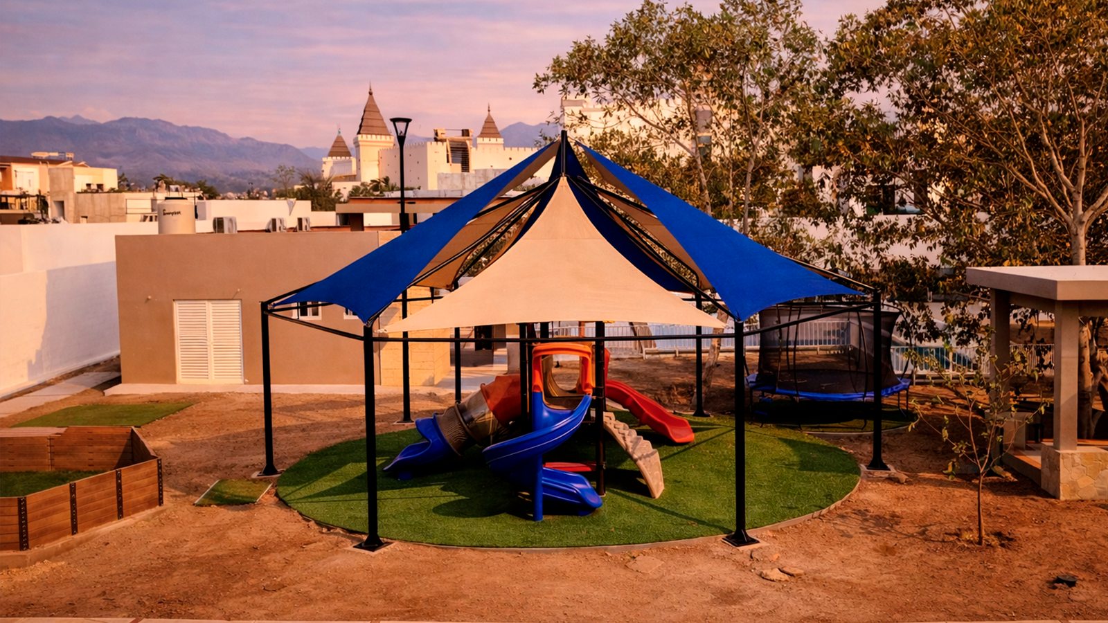 Sistema ligero que protege áreas de juego con alto nivel de radiación solar.